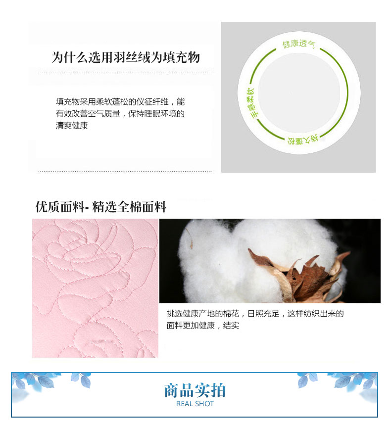 产品特点:填充物采用柔软蓬松的仪征纤维,能有效改善空气质量,保持睡眠环境的清爽健康。粉色面料,增添喜庆。